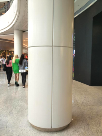 而無縫包柱鋁單板的應用則為大型裝飾場所提供了一個整體簡潔的視覺空間。在變化莫測的建筑設計中,簡潔平整的包柱設計反而成為了視覺的另一緩沖點,往往給人以舒適的享受。